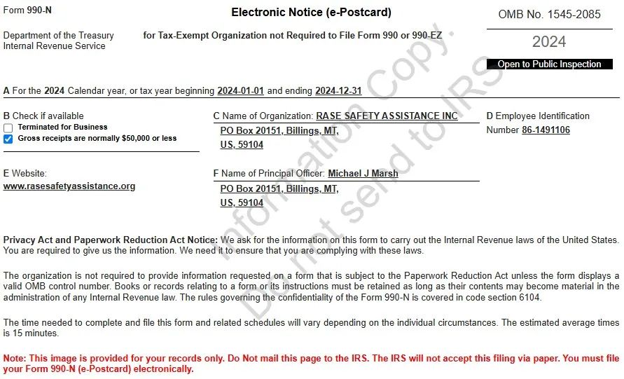 RASE Safety Assistance, Inc., a non-profit organization based in Billings, Montana, continues operations as an authorized non-profit entity under Internal Revenue Service Code section 501(c)(3).